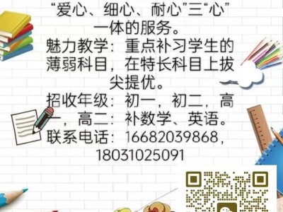 寒假补习班招生开始啦: 师资队伍:均985、211大学上学,具有过硬的专业素养和丰富的教学经验。提供“爱心、细心、耐心”三“心”一体的服务。 魅力教学:重点补习学生的薄弱科目,在特长科目上拔尖提优。 招收年级:初一,初二,初三,高一,高二:补数学、英语、物理。 一对一(可一对二),收费低,成绩提升快。 联系电话:,