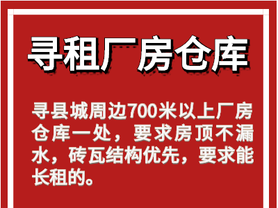 因业务拓展需要,现寻县城周边700米以上厂房仓库一处,要求房顶不漏水,砖瓦结构优先,要求能长租的。 杨先生,电话:19930828792。