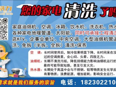 洗力专业家电深度清洗,空调,洗衣机,热水器,油烟机,太阳能,冰箱,冰柜,高温消杀(菌)(毒)除异味。另:挂机空调活动进行中,原价100元,现在团购(三台以上包含三台)价80元,带图转发朋友圈立减10元。欢迎随时来电,上门服务。电话:18230221019(微信同号)