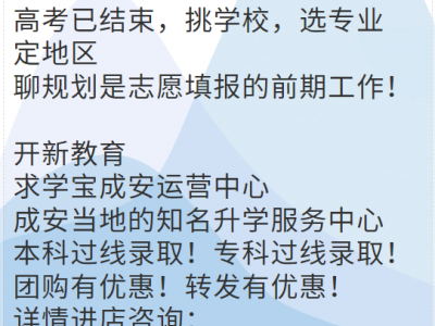 开新教育(求学宝成安运营中心)挑学校,选专业,定地区,聊规划!本科、专科过线录取!团购转发有优惠!详情进店咨询:成安新一中西门南行300米路西,电话,18617567000