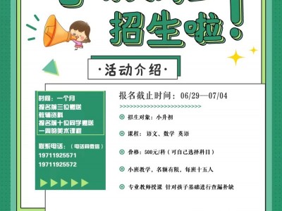 暑期冲刺班 2023暑期班,坚持教育在路上。 招收对象:新初一 课程:初一数学,英语,语文 ①专业老师授课,针对孩子的基础进行查漏补缺 ②提前预习新知识,在暑假进行弯道超车 报名前三位同学送教辅资料 报名前十位同学赠送一周的美术课程 优惠多多,转发朋友圈三天立减五十元。 小班教学,名额有限,先到先得。 报名电话(同微信)