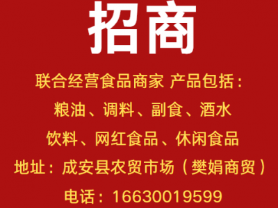招商:联合经营食品商家,产品包括:粮油、调料、副食、酒水、饮料、网红食品、休闲食品