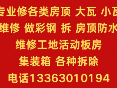 专业修各类房顶,大瓦,小瓦,维修,做彩钢,拆,房顶防水,维修工地活动板房,集装箱,各种拆除