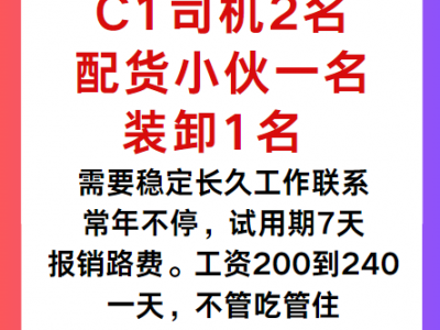 山东标准件仓库招聘C1司机2名,配货小伙一名,装卸1名,需要稳定长久工作联系,常年不停,试用期7天,报销路费。工资200到240一天,不管吃管住,年底有奖金。工资每月开。详情电议李