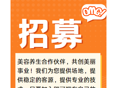 招募美容养生合作伙伴,共创美丽事业!我们为您提供场地,提供稳定的客源,提供专业的技术,只要加入即可拥有自己的事业,时间自由,创业无忧。加入我们,开启美丽新篇章。(年龄35岁以下,有美容经验或开店经验的优先)