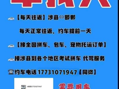 涉县至邯郸,每天往返火车站,高铁站,飞机场,市内,拼车,半小时一班车,五座,七座,九座,包车随时发车,联系电话17731071947(微信同号)