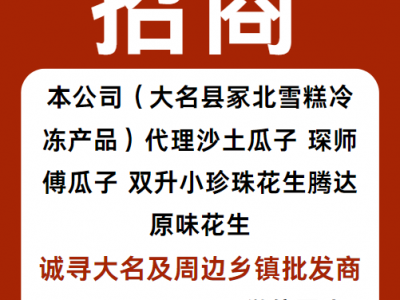 本公司(大名县冢北雪糕冷冻产品)代理沙土瓜子,琛师傅瓜子,双升小珍珠花生,腾达原味花生,诚寻大名及周边乡镇批发商,联系电话15132027711微信同步