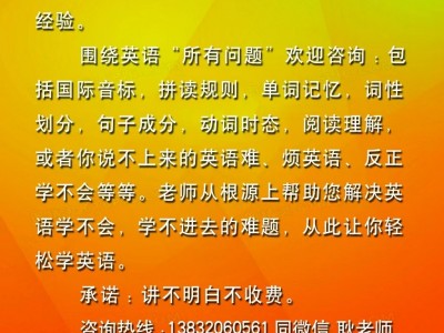 英语家教20元/小时。为减轻负担,挑战全网家教最低价,别人家教每小时40~60元,我们降至20元/小时,一对二,一对三,质量高,效果好,学习时长与次数由你来定。