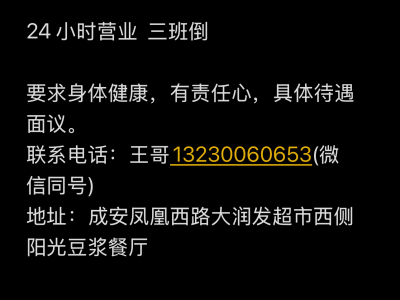 招人啦!阳光豆浆成安店 服务员2名 收银员1名 后厨熬粥2名 寒假工2名 要求;身体健康,有责任心,正常三班倒,有上夜班,工作时间8小时,公休2天,具体工资待遇来店里面谈!工资准时发放,非诚勿扰! 地址;成安县凤凰西路大润发超市西侧阳光豆浆餐厅