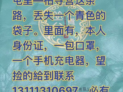 本人从成安一阳寺村-屯里一柏寺营这条路,丢失一个青色的袋子。里面有,本人身份证,一包口罩,一个手机充电器,望捡到联系、必有重谢