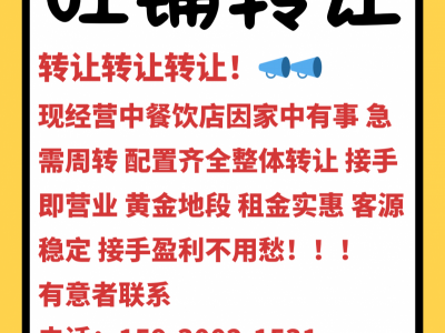 现经营中餐饮店因家中有事 急需周转 配置齐全整体转让,接手即营业 黄金地段 租金实惠,客源稳定 接手盈利不用愁!!!