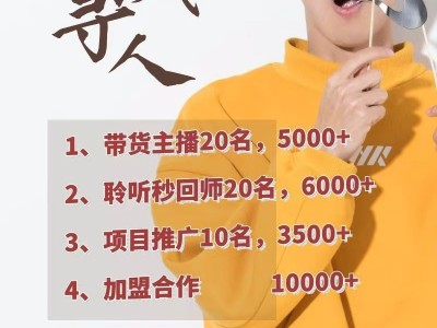 1.带货主播20名,5000+ 2.聆听秒回师20名,6000+ 3.项目推广10名,3500+ 4. 兼职合作,多模式,可在家做,利润可观,诚邀合作! 均可兼职,接受小白!可不出镜!快速入职!