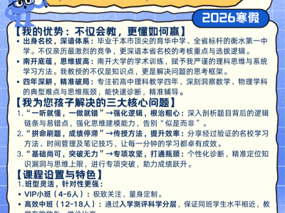 2026寒假初高中辅导招生啦! 专注解决初高中数学物理三大问题:一听就会但题总做不对;拼命刷题但成绩总提不上去;基础尚可但一做难题就无处下手。 育华、衡一、南开校友,让名校走上您的课桌! 欢迎微信咨询,进行学习能力诊断