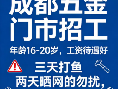 成都五金门市招工,年龄16-20岁,工资待遇好,三天打鱼 两天晒网的勿扰,长期干的联系